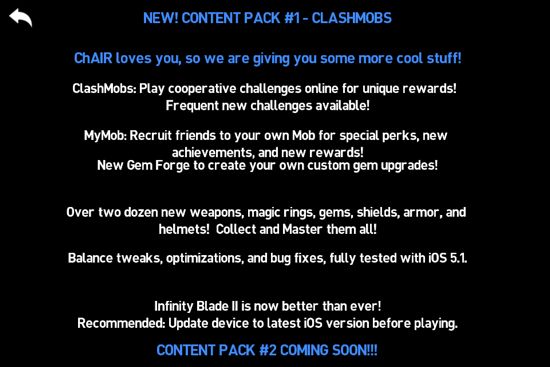The award winning iOS mobile games maker Chair Entertainment Group, LLC released an update to its Infinity Blade 2 franchise on the 2nd of August, 2012. This is a 1.04 GB full update where you have to re-download the entire game which by the way I really wished was an Incremental update with only what has changed.