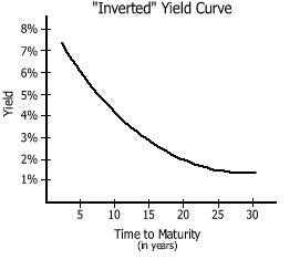This is called a negative yield curve and this is a situation where the short term interest rates are higher than the long term interest rates. This is a downward sloping curve and an illustration of a inverse yield curve is shown below.