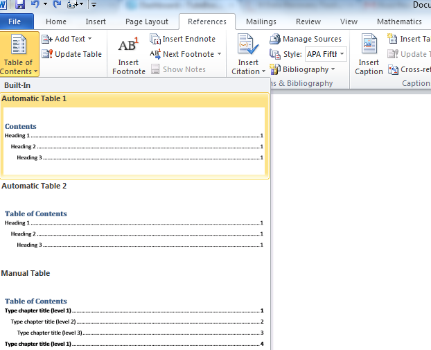 There you will find three options. First two are just the same except for their title. 3rd option is the manual version of the table of contents and I recommend not to use it until you are familiar with the basics. For the time being I’ve selected the 2nd option.
