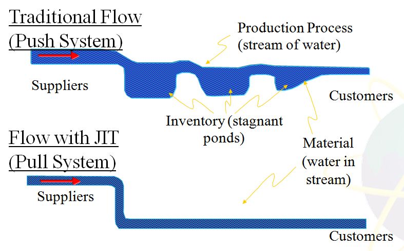 The whole concept of the JIT is differentiated from traditional productions systems using push vs pull systems of production. The push system of production pushes materials to the next stage of the production irrespective of whether time and resources are needed at the next level of production creating lot of inventories at each level of the production flow. The traditional manufacturing organizations adopt push system where they produce for inventory and work in progress. The pull system of production is where the materials are pulled by next level of the production only when is signaled or required by the next stage of production. This drastically reduces the inventory held as it does not keep any work in progress. JIT concept is built based on the concept of pull production which eliminates the total inventory.